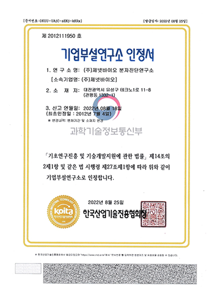 | 특허 | 제 10-1546358호 | 주식회사 제넷바이오 | Taq DNA 중합효소의 신규한 제조방법 |